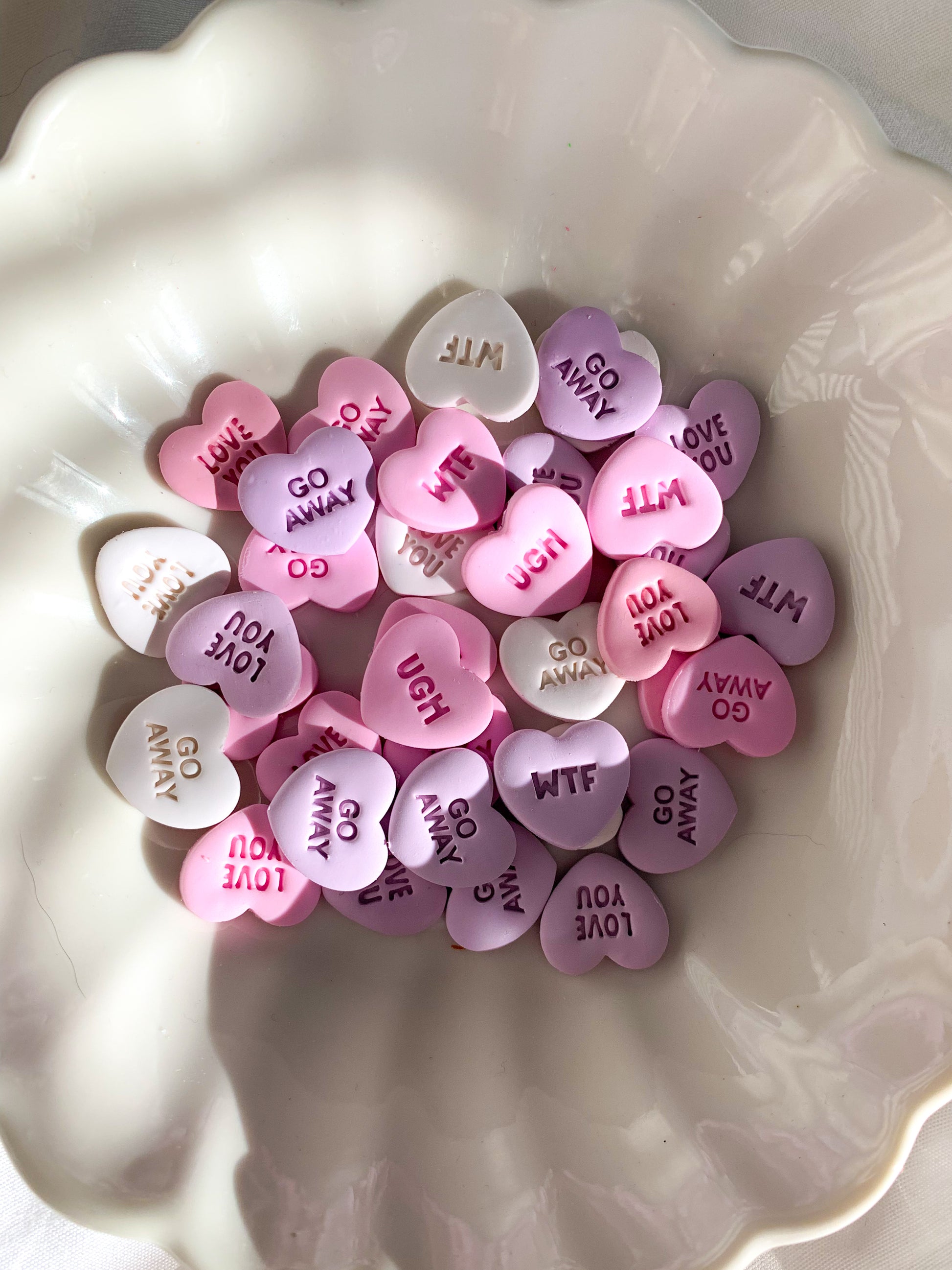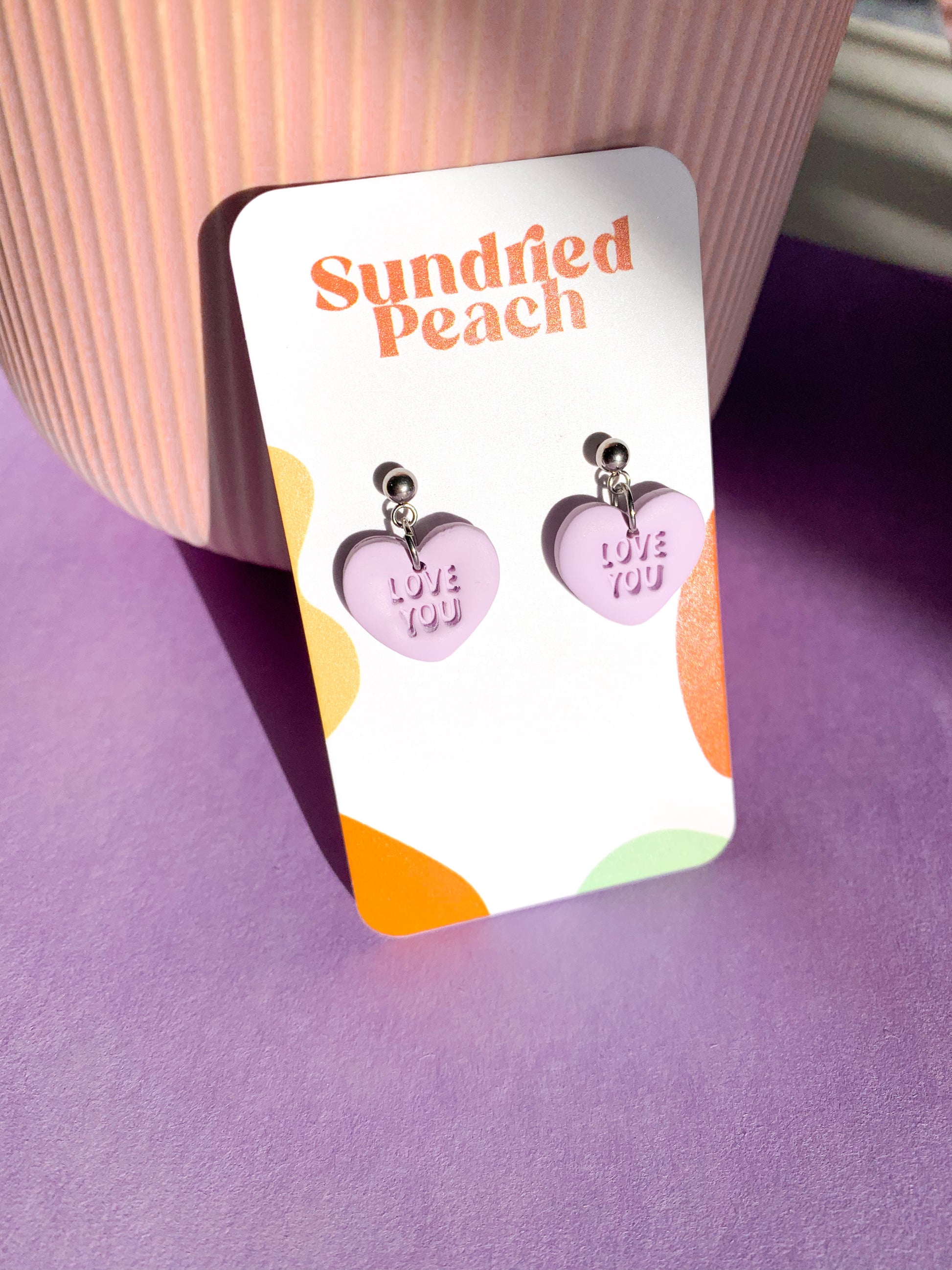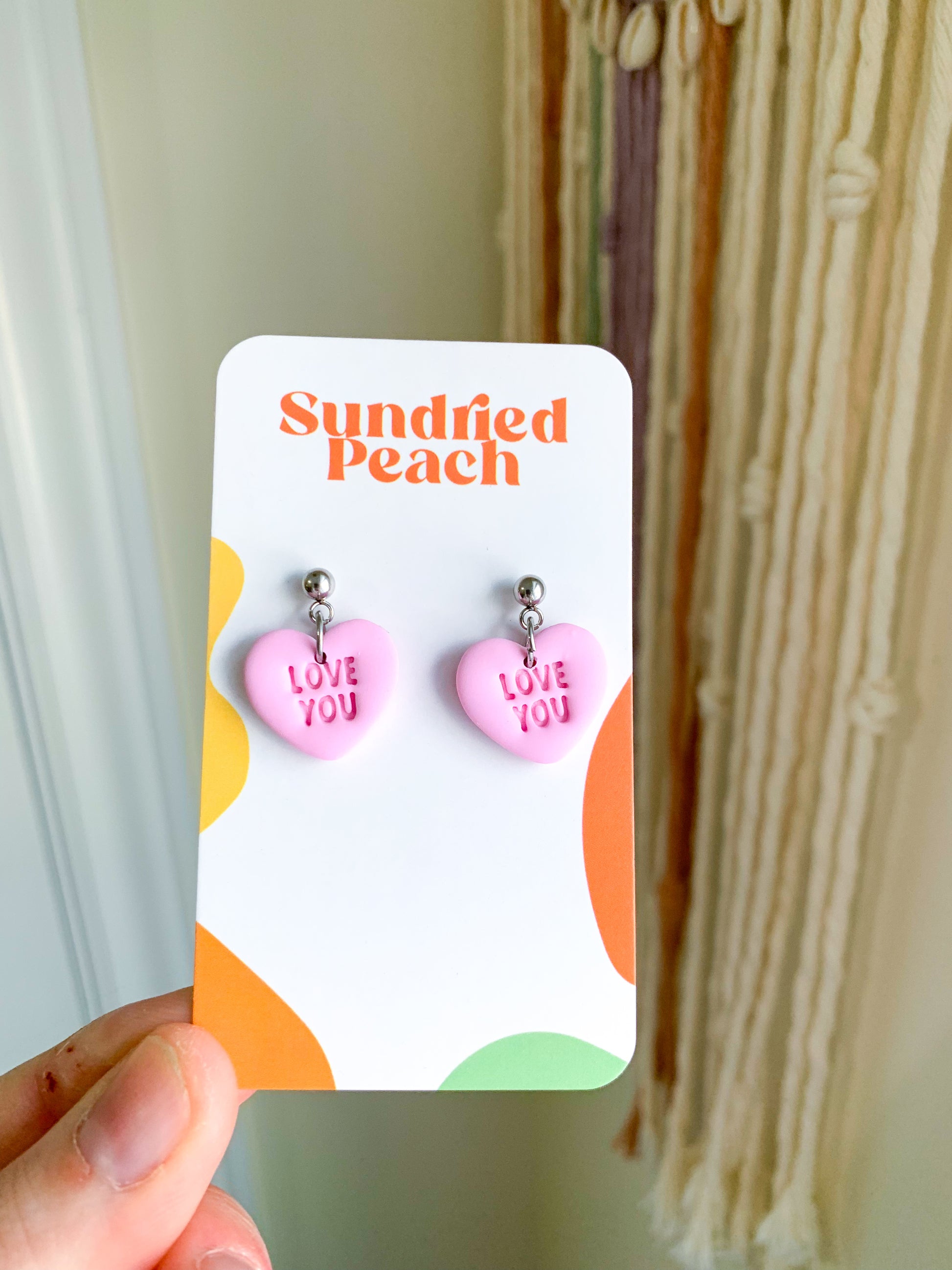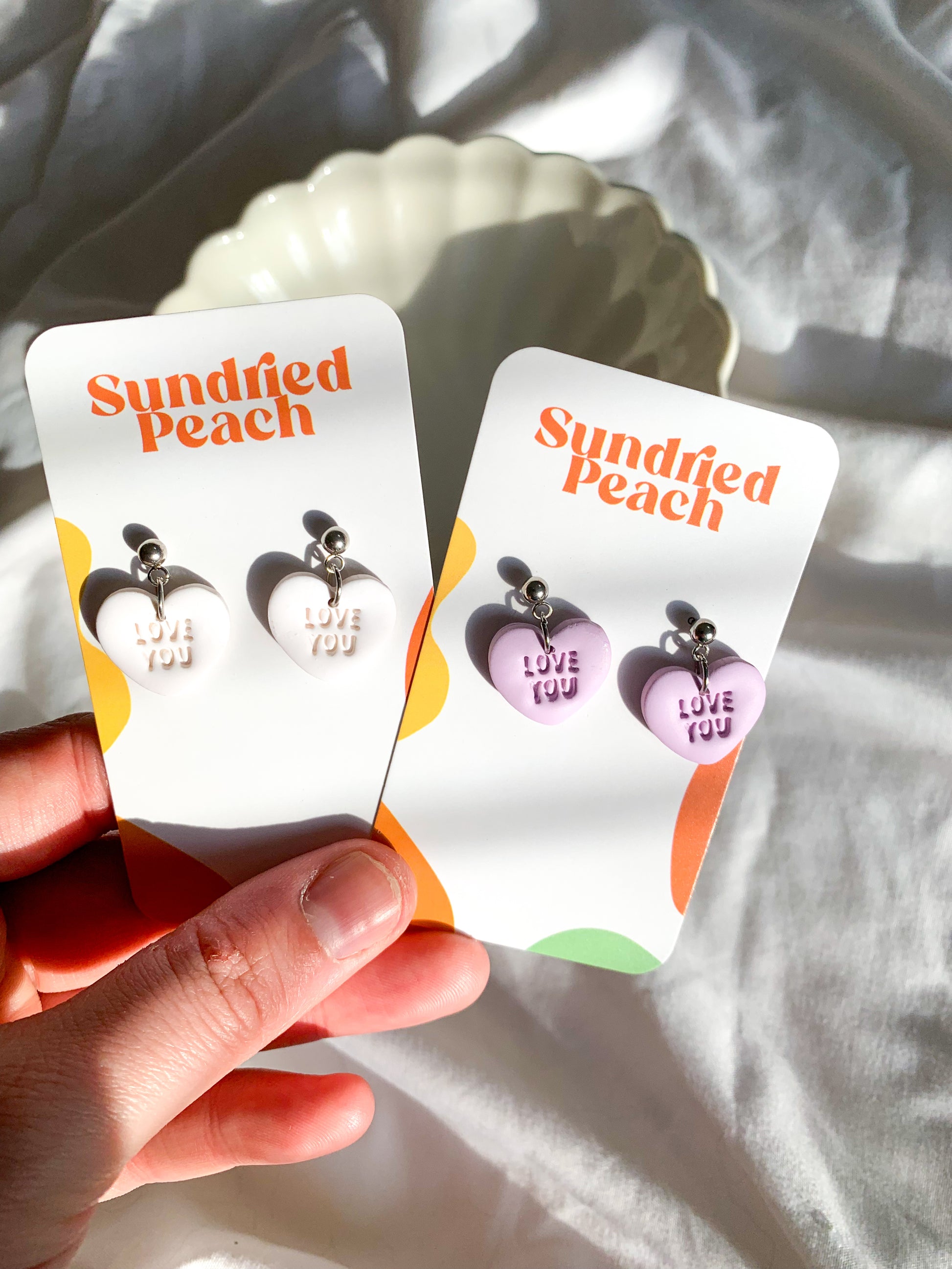 These are a staple to have in my shop for the Valentine's Season. They remind me of those Candy Hearts I used to eat as a kid this time of year. Get nostalgic and wear these this Valentines.